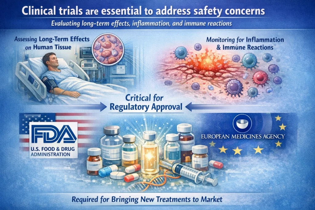 Clinical trials will also help address any potential safety concerns that may not have been fully elucidated in preclinical studies, including long-term effects on human tissue and the risk of inflammation or immune reactions. Such trials will be critical for gaining approval from regulatory bodies such as the U.S. Food and Drug Administration (FDA) or the European Medicines Agency (EMA), which are essential steps for bringing any new medical product to market.