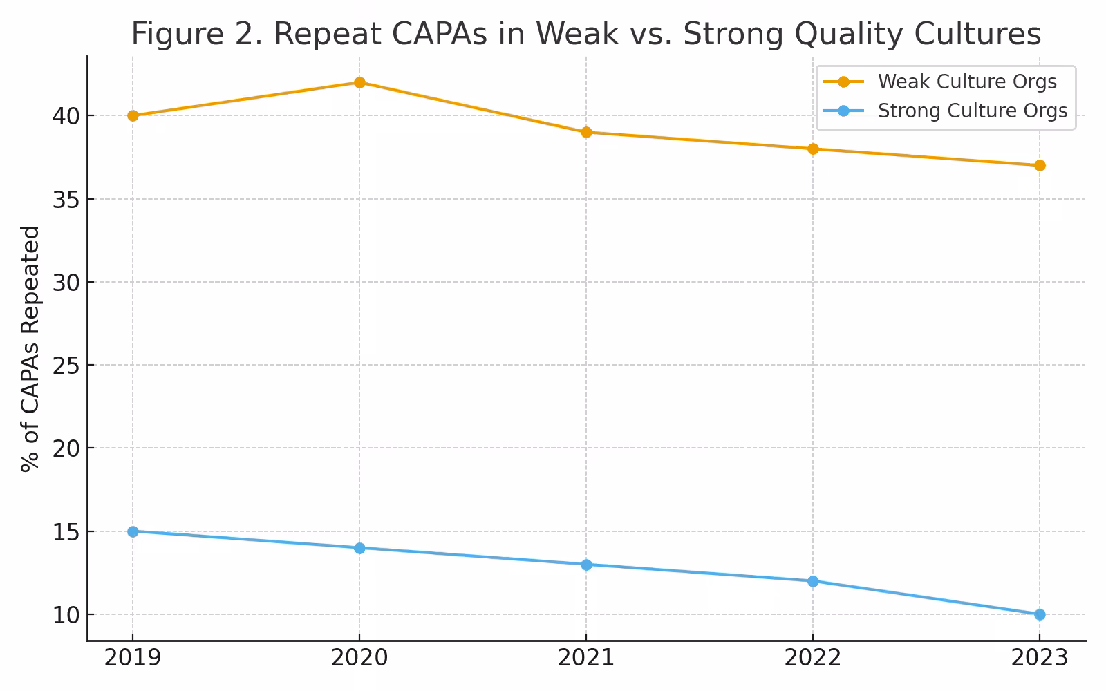 Organizations with weak quality culture report repeat CAPAs in 35–40% of cases, reflecting superficial fixes. In contrast, organizations with strong culture reduce repeat CAPAs to 10–15%, demonstrating systemic problem-solving.