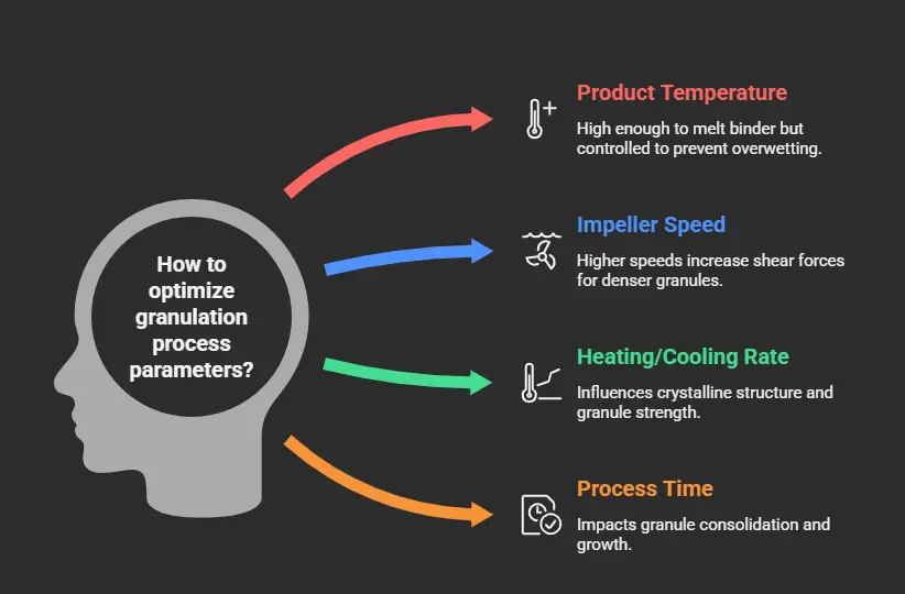 - Process Time: The duration of the molten state (kneading time) impacts granule consolidation and growth.