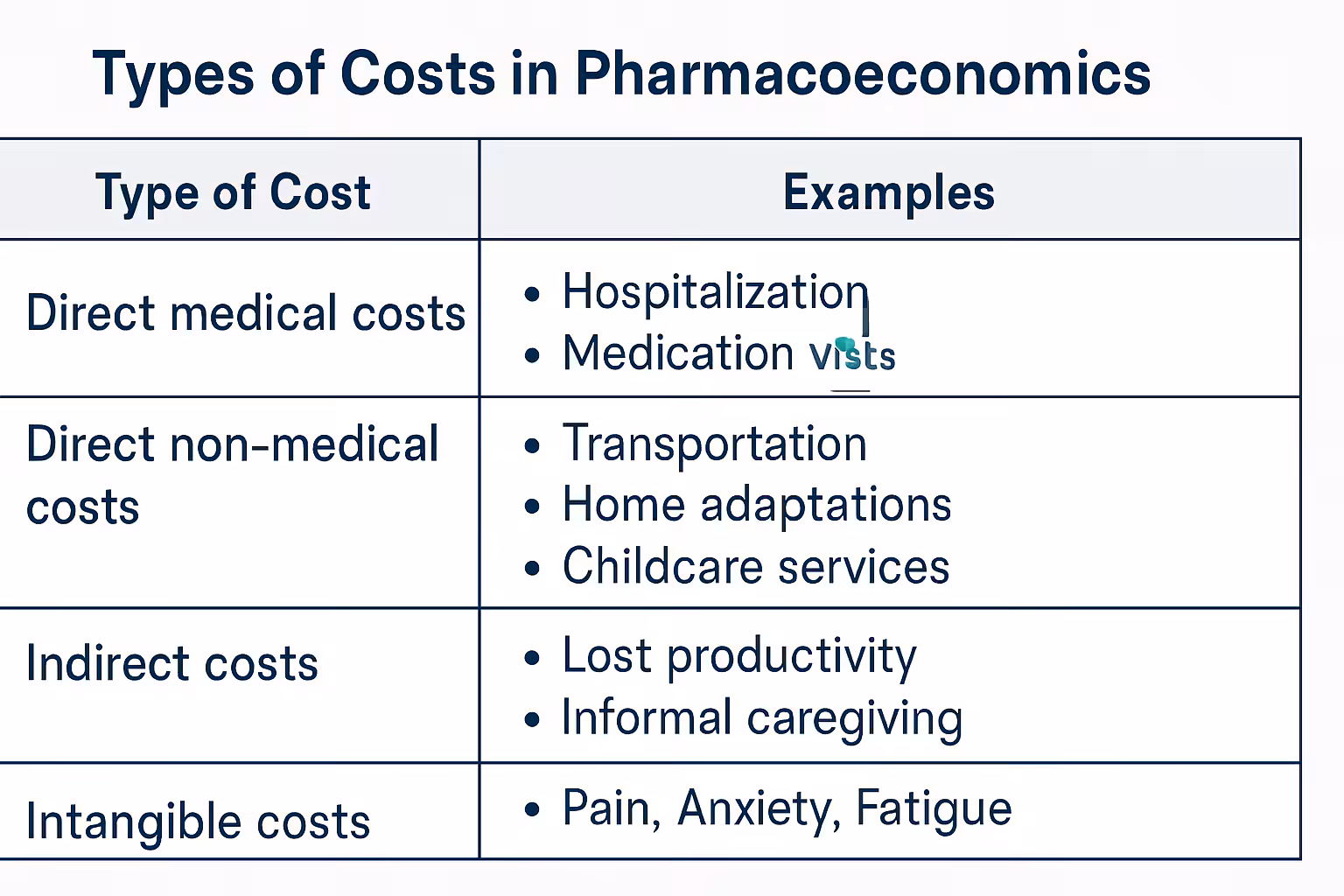 - Payer Perspective: Considers costs reimbursed by the payer (insurance, government). Includes drug costs, hospitalization, and covered physician visits.